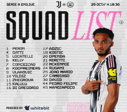 雷速體育10月29日宣 北京時間10月30日凌晨1:30,尤文圖斯將在意甲主場迎戰烏迪內斯,賽前尤文官方公布了球隊本場的大名單。其中隊內的法國中場凱夫倫·圖拉姆,缺席了本場比賽的大名單。