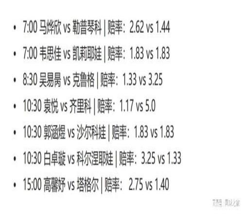 從當前博彩公司對中國七將開出的賠率來看,只有吳易昺和袁悅最被看好;韋思佳和郭涵煜被則是有希望獲勝;其他人想晉級,至少從賠率而言,可能都得有比對手更上佳的發揮才行。(來源:網球之家 作者:月亮河的星空)
