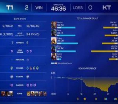 體育資訊01月23日稱 T1 2:0 KT,賽后數(shù)據(jù)面板顯示T1在落后13.9k經(jīng)濟(jì)差的情況下最終翻盤比賽。
