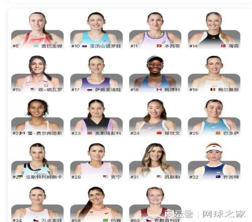 從目前阿布扎比的參賽球員來看,整體陣容是相當豪華,除了鄭欽文,還有萊巴金娜、亞歷山德羅娃、克雷吉茨科娃、本西奇、陶森、納瓦羅、薩姆索諾娃、姆博科、萬卓索娃、梅爾滕斯、費爾南德斯、奧斯塔彭科、巴多薩、雅斯特雷姆斯卡、肯寧、瑪雅、凱斯勒等大家非常熟悉的球員。