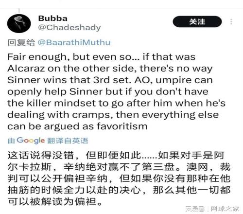 斯皮澤里的支持者們憤怒地指出,暫停恰好出現(xiàn)在辛納最脆弱的時刻,這“過于巧合”地拯救了意大利人。社交媒體上,“規(guī)則干擾勢頭”的討論迅速升溫。有網(wǎng)友尖銳指出:“如果這是足球比賽,對手受傷倒地后重新開球,受傷方球員會立刻將球踢出界外以示體育精神,但網(wǎng)球規(guī)則沒有這樣的傳統(tǒng)。”